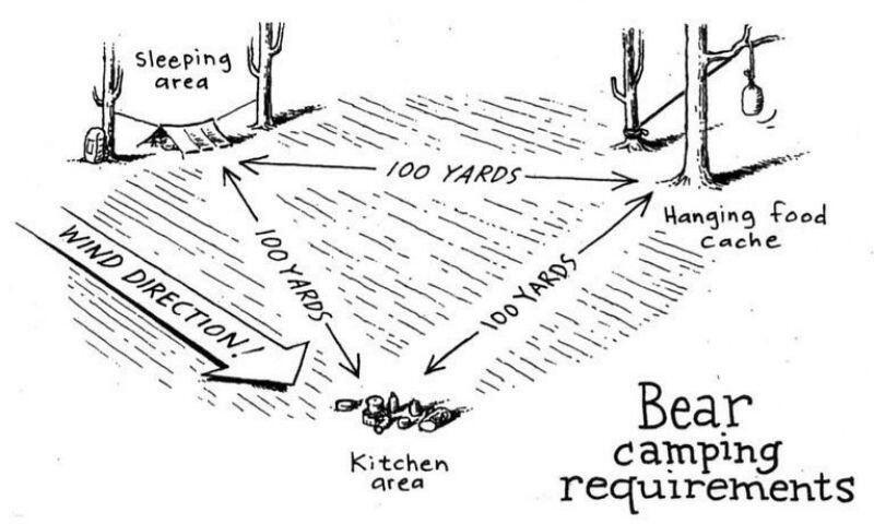 Personal Note: I used this method while backpacking in Denali National Park in Alaska. The rangers there recommend to sleep 100 yards away from where your food is stored. Then, eat and cook 100 yards away from both your camp and food storage spot. This creates a triangle. Think of your tent as one point of the triangle and your food storage and cooking spot the other two points of the triangle.