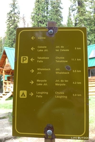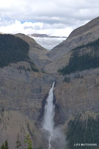 The turnoff to the start of the trail is a 20 minute drive from Lake Louise, Alberta, and 45 minutes from Golden, BC. Add another 15 minutes or so to drive the windy road (usually full of tourist RV traffic in summer) to the Takakkaw Falls trailhead.