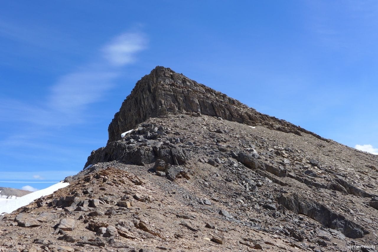 After we admired the lake and had a nice relaxing lunch, we took off on the scree slopes to summit Mount Kerr. Though it is an easy scramble, there is lots of loose rock on this mountain. I recommend traversing to the right as long as you can and then gain the ridge via a more gentle slope rather than heading up the painfully loose and tedious (and steeper) way directly up from the lake.