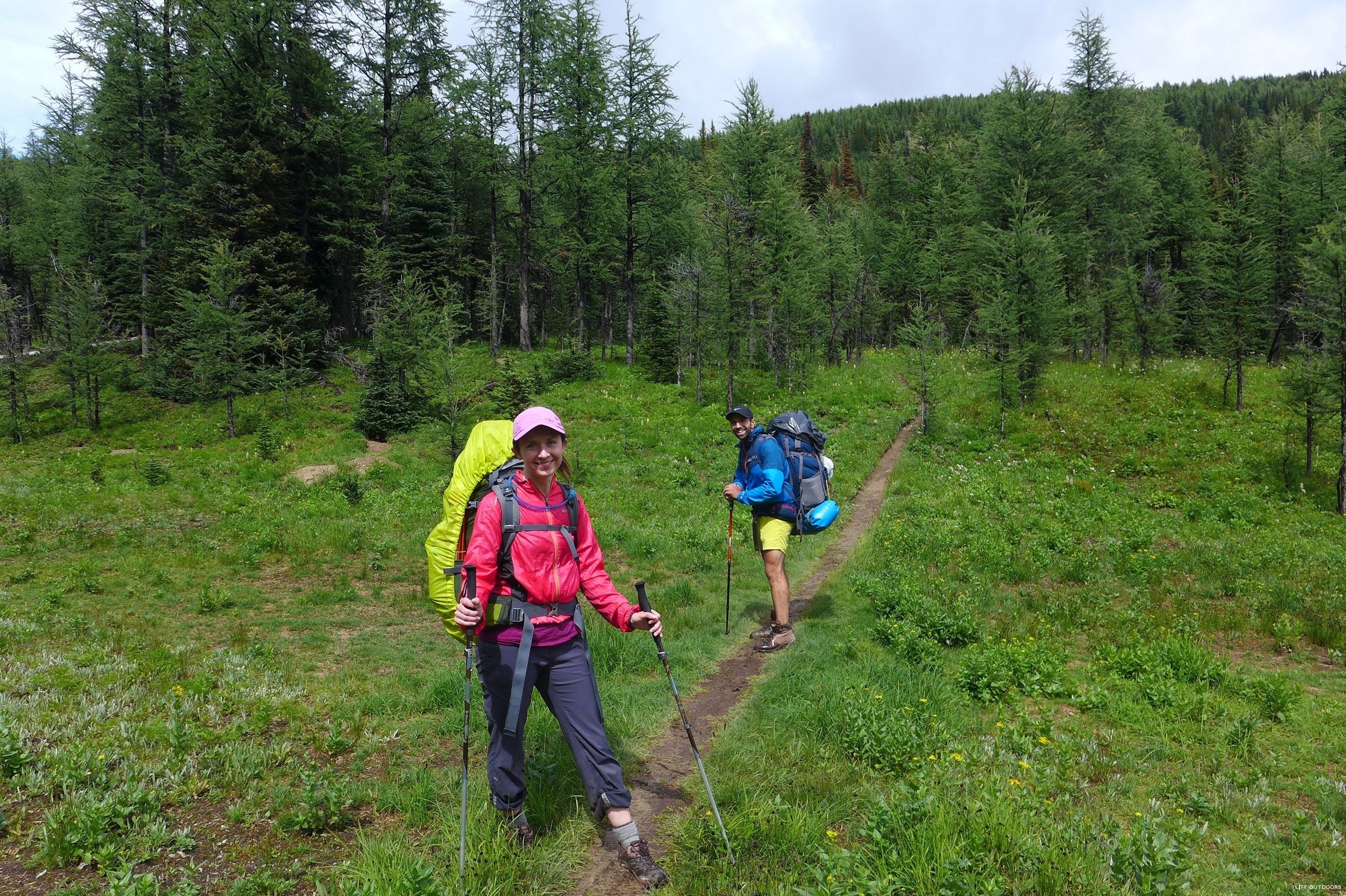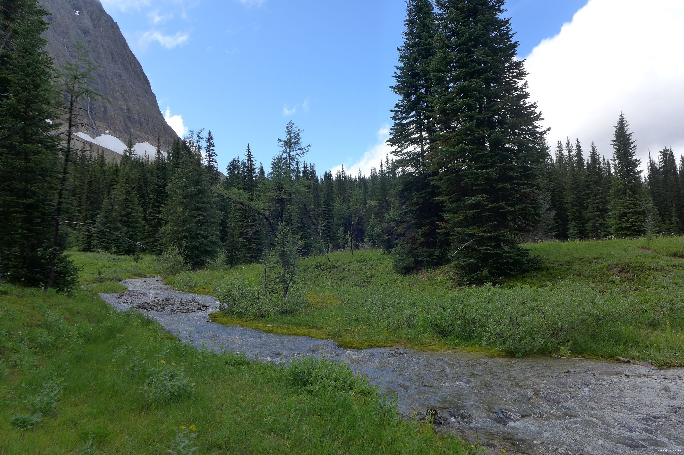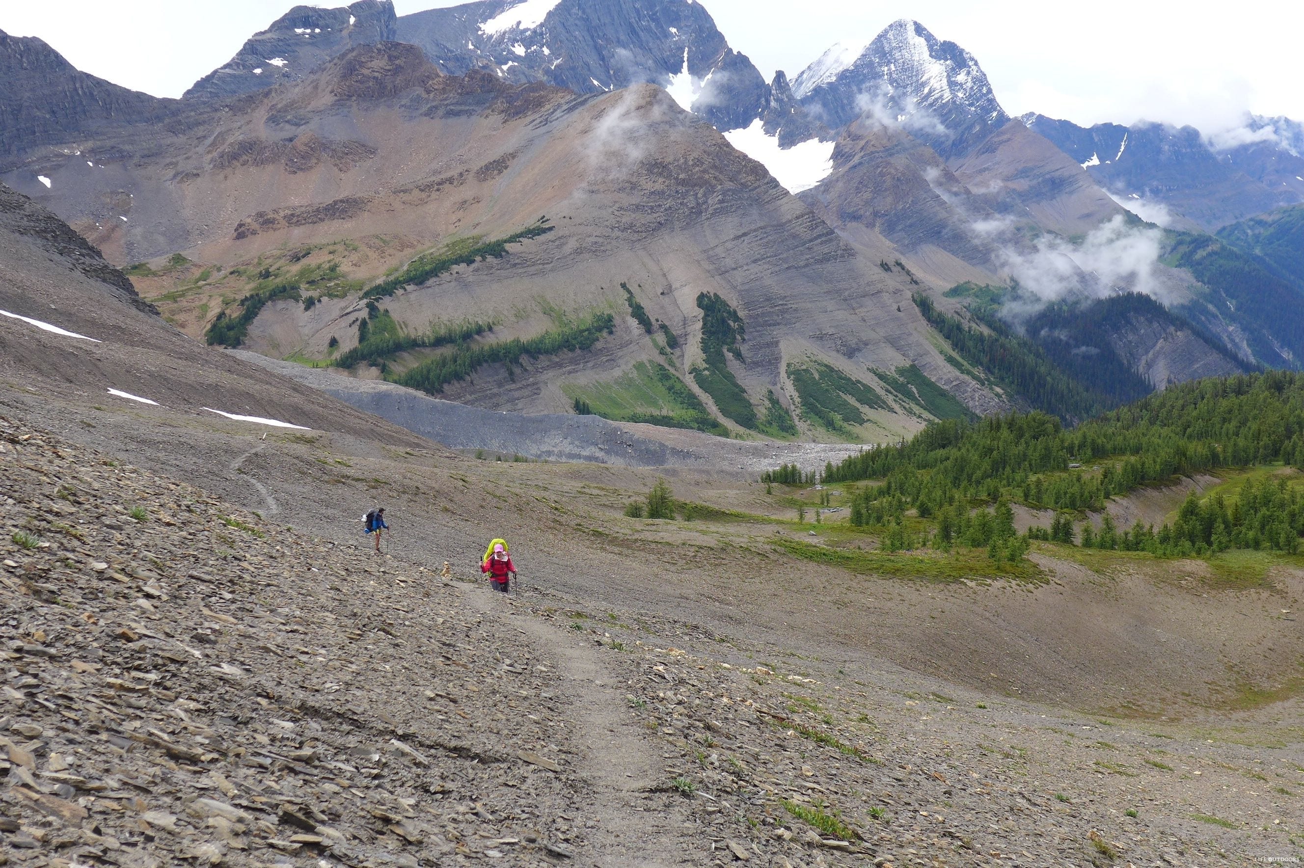 The trail can be done either North to South, or South to North. If you start from the South, you’ll start at Floe Lake trailhead, and hike out at Paint Pots trailhead. Most parties opt to start at Floe, and spend their last night at Helmet Falls. We hiked the trail from North to South.