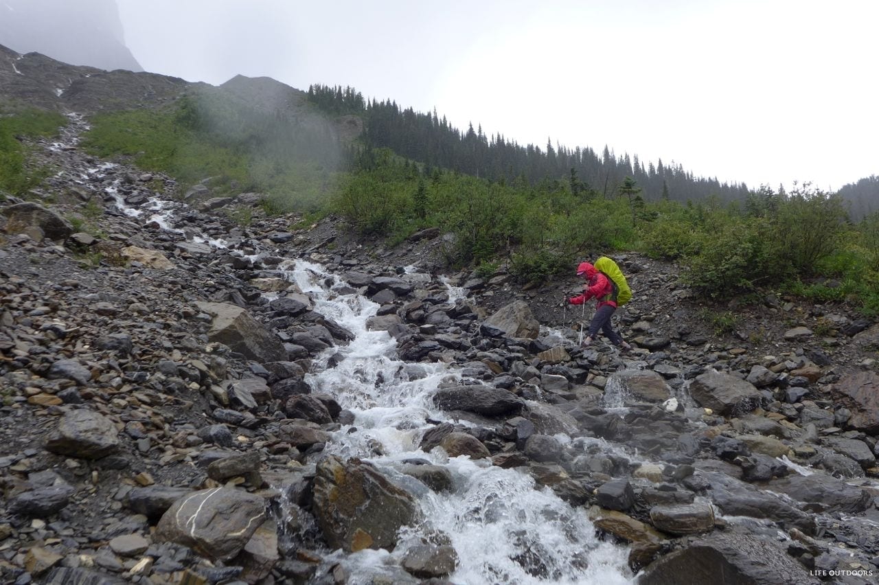 We highly recommend you start the day by taking the side trail that leads you to the base of Helmet falls. Take your backpack and gear for this side trip – the trail branches off from the main trail before you cross the creek to climb up Rockwall Pass. We didn’t get a chance to go up to the waterfalls as we were in pouring rain, and were simply trying to get to our next campsite as quick as possible to avoid the rain.