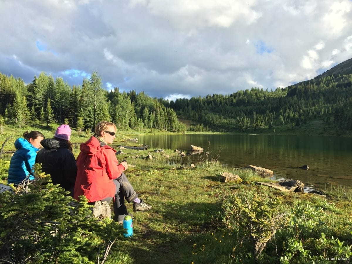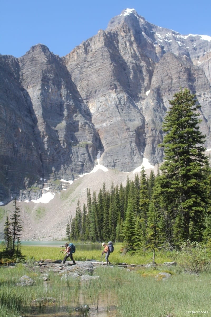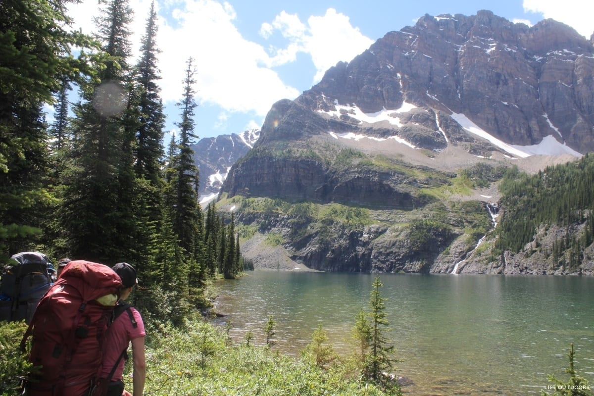 Once you hit just above Og Lake, you’ll finally be rewarded with water and a closer view of Mount Assiniboine. Og lake campground is really nice and open, and when it’s hot, you can brave the cold waters for a swim. It was hot on our hike and we were quite dehydrated so we were tempted to jump in! It’s worth a stop. In hindsight, we wished we had spent the night at Og lake, it’s not busy and well worth a visit.