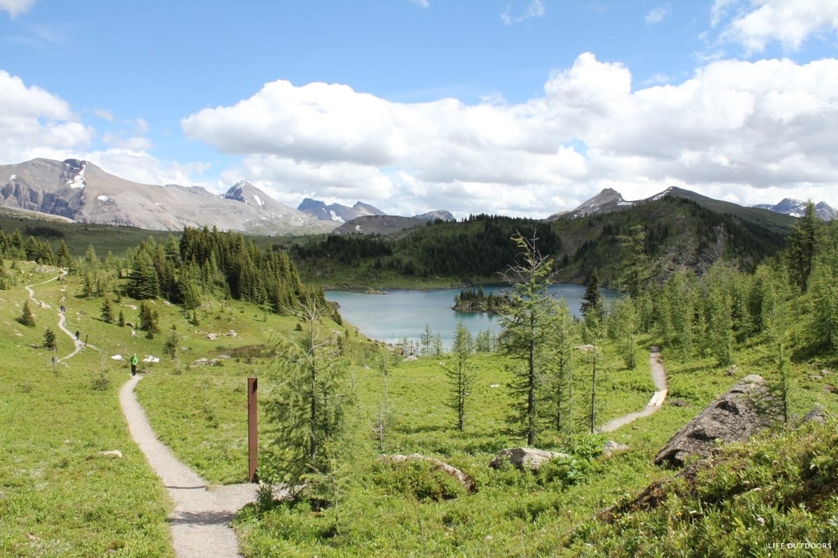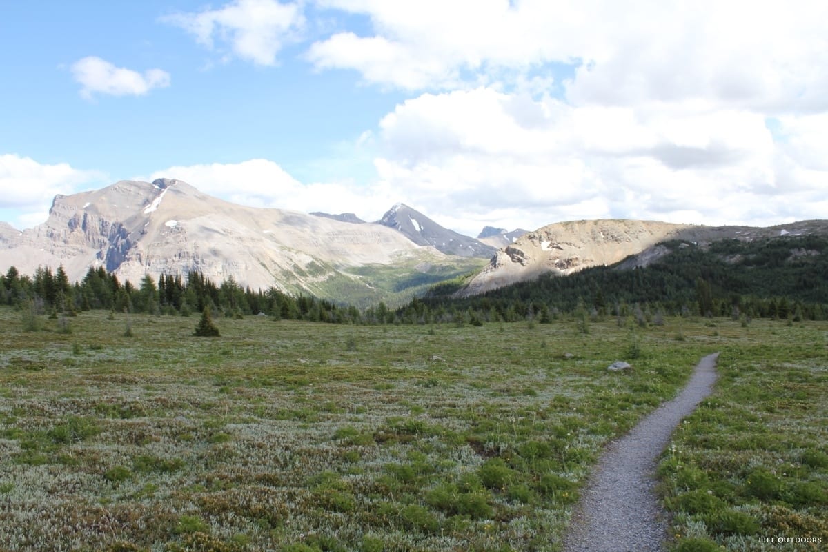 After going past Rock Isle lake, you continue for several kilometers on open alpine meadows with great, unobstructed views in all directions. This is a great spot for wildlife. Look out for Grizzly bears – you might see one here from far away.