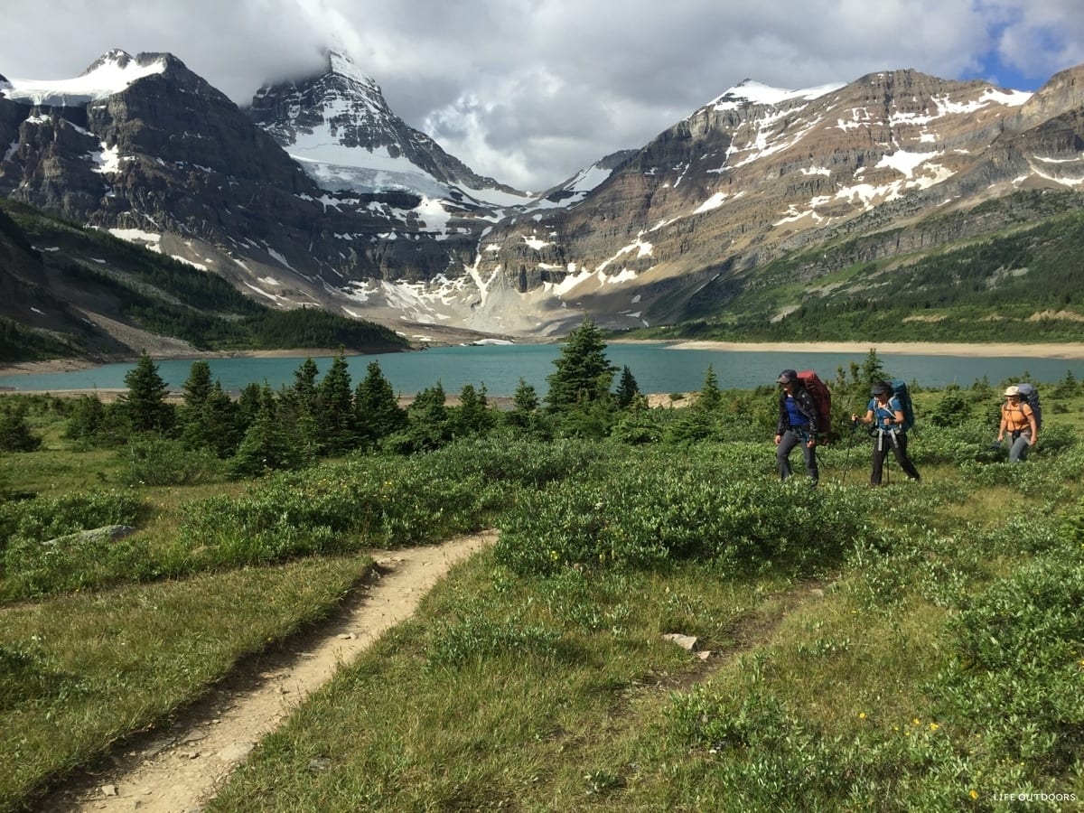 Today we would make what is considered the “crown” of the trip, making it to Mount Assiniboine. After leaving Howard Douglas lake, we walk along alpine meadows for another few hours before topping out at Citadel Pass (~2400 m). We saw a small grizzly bear here. Make sure you grab water from one of the streams before you hike down the other side of the pass, there is no water available for hours and hours – we were all very thirsty and made a beeline for Og Lake, the first place to get water after Citadel pass!