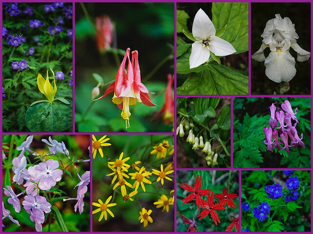 Flowers: Ferns, adder’s tongue, spleenwort, bloodroot, wild geranium, among others