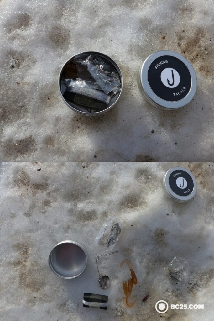 The image below shows how the items pack away tightly in their individual containers. In the image, the fishing tackle kit is expanded to reveal fishing line, hooks, bait and more.