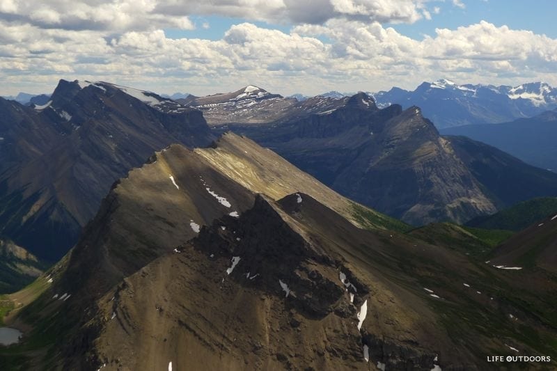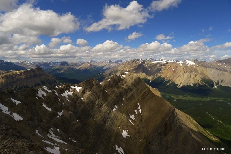 Gaining the ridge of Richardson is a bit of a grunt, but it is very scenic. Find the lowest angle scree you can, and traverse across. Once you pop up on the ridge you will be glad you made the effort. A huge yawning cirque that forms Richardsons south side is amazing, and you can view the whitehorn chutes on Lake Louise ski area, and much of the giants from the Valley of the Ten Peaks – this valley is a chain of peaks that surround Moraine lake and each are over 10,000 feet high. The higher you get on Richardson, the more impressive the views become. Richardson itself is quite high.