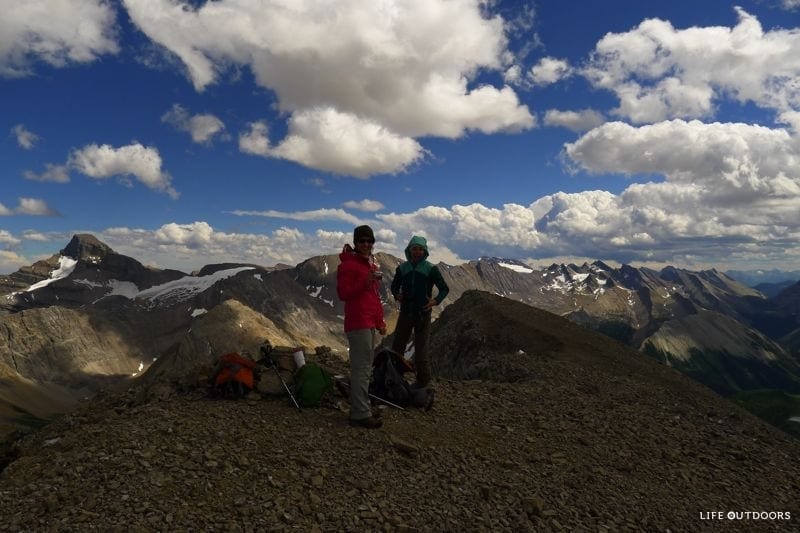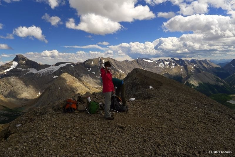 We hiked up again to Boulder Pass and felt the wind blowing steady at over 45 km/hr, with gusts of 60 km/hr. This was a part of the storm that was rolling through. Again, another confirmation for me that going on an exposed ridge is a bad idea. I wondered what we could try climbing in this weather. It would have to be sheltered from the wind and not too high, so Mount Redoubt (2,902 m, 9,521 ft) was out, with it’s tricky and loose ridge and long hiking distance over scree.
