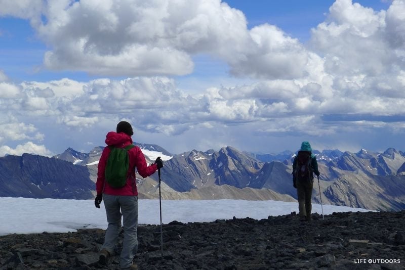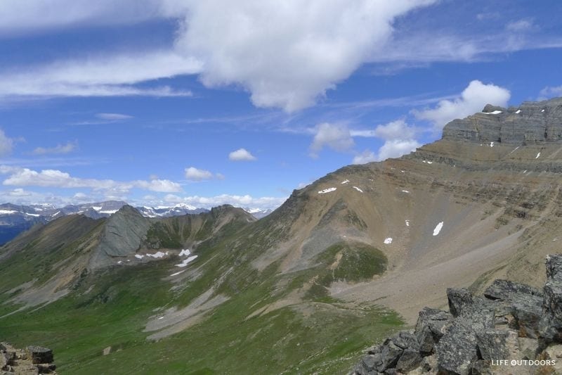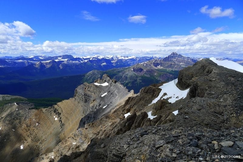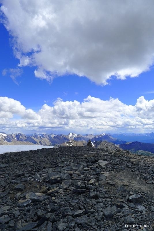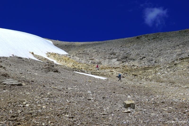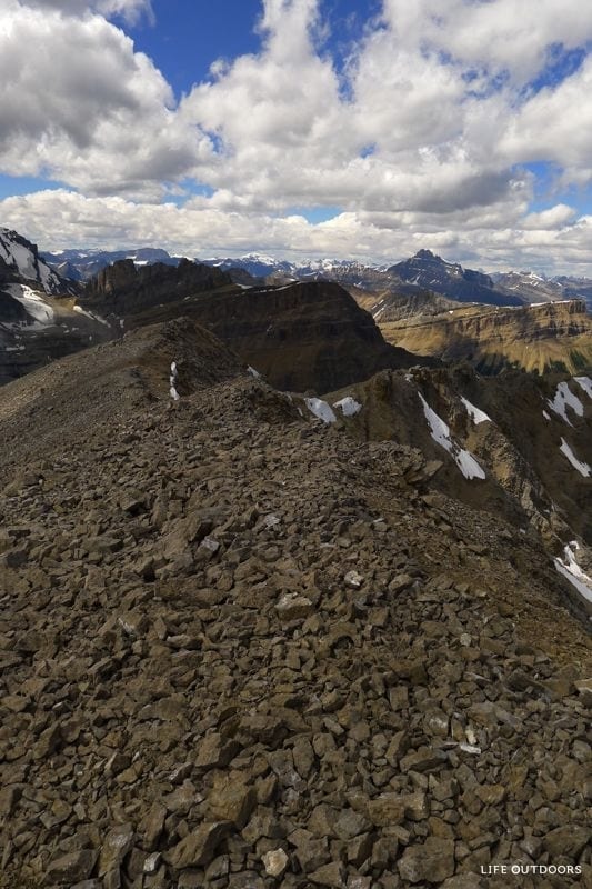 You stay on this ridge for a while then make your way up a steep talus slope, always taking the lowest angle line. There are faint trails all over the place, so just pick one that is the most comfortable. From the shoulder to the summit it takes less than an hour. Once you get to the summit plateau, you will see a big snowfield in front of you, so turn left (south) to get to the summit. The rest of the scramble is an easy ridgewalk. Views of Mt. Hector, the bath glacier, Mount Balfour and the Wapta Icefield are all visible.
