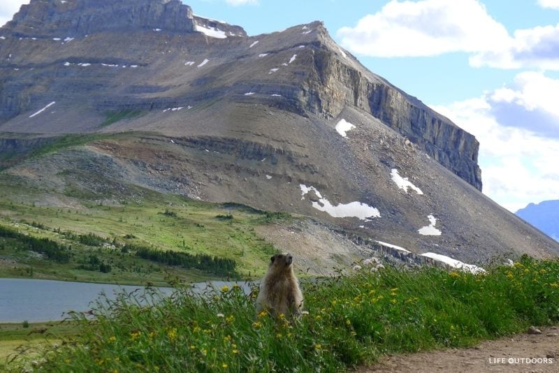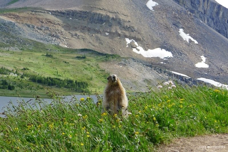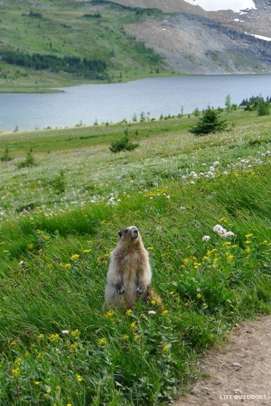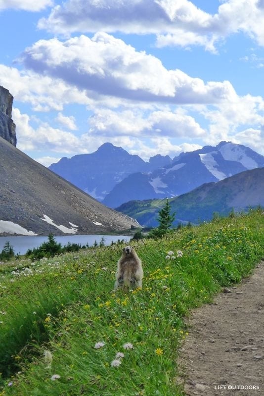 The wildflowers were in bloom so there was lots of cliché flower-with-mountain-backdrop photography. We couldn’t help ourselves. The wildflower season is so short in the mountains. That, and we were greeted by a photogenic and very curious marmot on our way. There are lots of marmots and pikas in this area, and you will find if you run into a marmot, they are just as curious about you as you are about them.