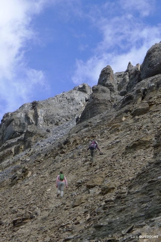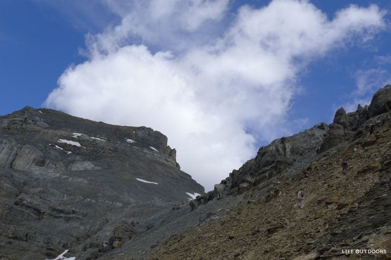 So we hiked over Boulder Pass and along the shore of the gorgeous and amazingly blue-coloured Ptarmigan Lake. It’s a lovely valley, and the lake sits perfectly nestled in between Redoubt, Boulder pass and Ptarmigan Peak. The trail along the shore is very easy and well graded, and then you take the turnoff and climb up to Deception pass (towards Skoki Lodge). The route up Fossil begins at the summit from Deception, just turn right off the trail and pick up some faint animal trails along the pass, then you will find a trail on the scree that you follow all the way up.
