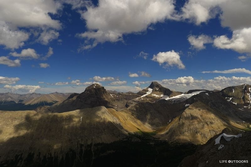 There are many scrambling objectives in the area. Mount Richardson (3,086 m, 10,125 ft) is just beyond Hidden Lake, as well as Pika Peak (3,053 m, 10,016 ft) and nearby Mount Partmigan (3,035 m or 9,957 ft), can all easily be done in a day from Hidden Lake. In fact, it’s possible to hike in to Hidden Lake, set up your tent and leave you gear, and go climb these mountains all in a row. At the least you could do Richardson and Pika, climbing all three would warrant a longer day due to the descent you have to do to access Ptarmigan, likely taking in excess of 9 hours return from the lake if not longer. Years ago we hiked into Hidden Lakes, set up camp and climbed Richardson and Pika, the climbs taking us 7 hours return from hidden lake. To tack on Ptarmigan would likely have been an extra 2-4 hours.
