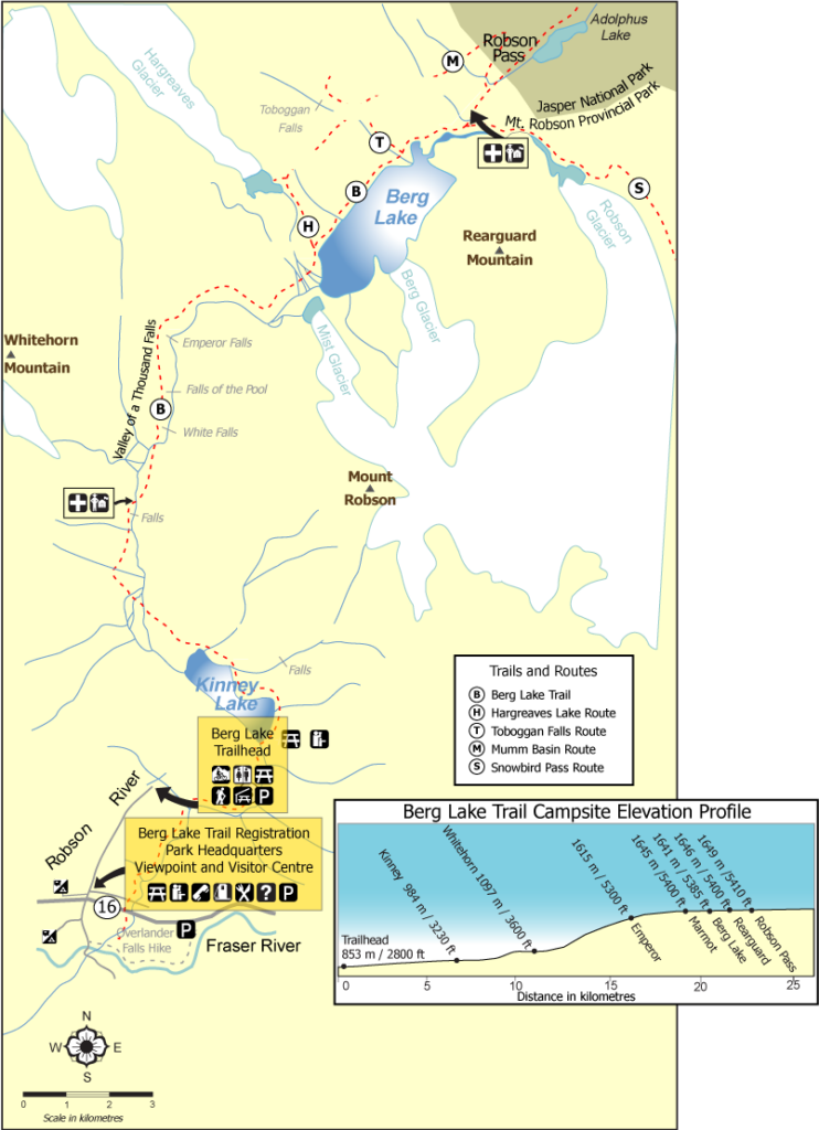 The main hiking trails in the area at Robson. Image from BC Parks. (https://discovercamping.ca/BergLake?Type=6)